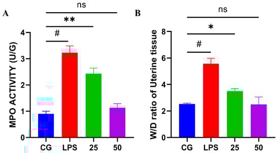 Consequence of GnRb1 against MPO activity assay and W/D ratio in mice uterus. (A) MPO (U/G) activity. (B) W/D ratio. CG represents the control group. LPS reveals the LPS-induced groups. The 25 and 50 are the GnRb1-administrated groups representing 25 mg/kg and 50 mg/kg per animal, respectively. GnRb1 indicates the Ginsenoside Rb1. MPO indicates the myeloperoxidase, whereas W/D depicts the wet to dry weight ratio. Data statistics are demonstrated as mean ± S.E.M. The # p < 0.001 CG versus LPS group, * p < 0.05, ** p < 0.01, and ns indicates the nonsignificant difference between CG versus LPS + GnRb1 groups.
