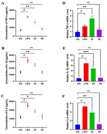 Effects of GnRb1 against LPS-induced production of pro-inflammatory cytokines. The concentration of: (A) the TNF-α (pg/mL); (B) the IL-1β (pg/mL); and (C) IL-6 (pg/mL). The relative mRNA expression levels of (D) TNF-α, (E) IL-1β; and (F) IL-6. CG represents the control group. LPS reveals the LPS-induced groups. The 25 and 50 are the GnRb1-administrated groups representing 25 mg/kg and 50 mg/kg per animal, respectively. GnRb1 indicates the Ginsenoside Rb1. Data statistics are demonstrated as mean ± S.E.M. The # p < 0.001 CG versus LPS group, * p < 0.05, ** p < 0.01, *** p < 0.001, and ns indicates the nonsignificant difference between CG versus LPS + GnRb1 groups.