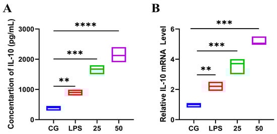 Effects of GnRb1 against LPS-induced production IL-10 concentration. The concentration of (A) IL-10 (pg/mL). The relative mRNA expression level of (B) IL-10 in uterine tissue. CG represents the control group. LPS reveals the LPS-induced groups. The 25 and 50 are the GnRb1-administrated groups representing 25 mg/kg and 50 mg/kg per animal, respectively. GnRb1 indicates the Ginsenoside Rb1. Data statistics are demonstrated as mean ± S.E.M. The ** p < 0.001 CG versus LPS group, ** p < 0.01, *** p < 0.001, **** p < 0.0001, and ns indicates the nonsignificant difference between CG versus LPS + GnRb1 groups.