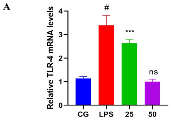 Effects of GnRb1 against LPS-induced expression of the TLR4. (A) The relative mRNA expression level of the TLR4 gene. (B) The protein expression of TLR4. CG represents the control group. LPS reveals the LPS-induced groups. The 25 and 50 are the GnRb1-administrated groups representing 25 mg/kg and 50 mg/kg per animal, respectively. GnRb1 indicates the Ginsenoside Rb1. Data statistics are demonstrated as mean ± S.E.M. The # p < 0.001 CG versus LPS group, ** p < 0.01, *** p < 0.001, and ns indicates the nonsignificant difference between CG versus LPS + GnRb1 groups.