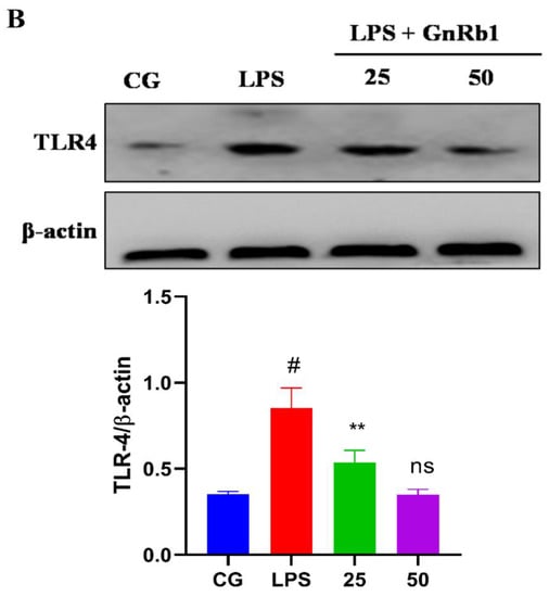 TLR4 is activated as the host defense mechanism against LPS. As displayed in the results of RT-qPCR (Figure 6A) as well as Western blot assay (Figure 6B), TLR4 expression was dramatically increased (p < 0.05) in the LPS group. However, GnRb1 therapy suppressed (p < 0.05) the LPS-stimulated TLR4 expression.