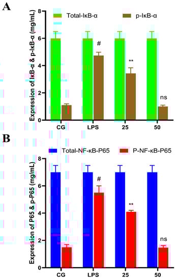 Effects of GnRb1 against LPS-induced expression NF-κB pathway proteins measured by ELISA. (A) The expression levels of the NF-κB p65 and its phosphorylated (p-NF-κB p65) form. (B) The expression levels of total IκBα and its phosphorylated (p-IκBα) form. CG represents the control group. LPS reveals the LPS-induced groups. The 25 and 50 are the GnRb1-administrated groups representing 25 mg/kg and 50 mg/kg per animal, respectively. GnRb1 indicates the Ginsenoside Rb1. Data statistics are demonstrated as mean ± S.E.M. The # p < 0.001 CG versus LPS group, ** p < 0.01, and ns indicates the nonsignificant difference between CG versus LPS + GnRb1 groups.