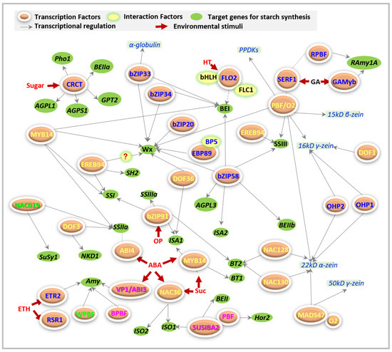 Starch was and remains an essential commodity in food and non-food industries. Cereal seeds provide a great account of starch production, and thereby, starch synthesis and its regulation in seed endosperm have been investigated by researchers of breeding. The enzymes involved in starch synthesis have been well identified in cereals, but, until now, the regulatory mechanism underlying starch synthesis has not been fully understood, especially regarding the regulators on starch synthetic genes. As the key regulators mediating gene expression, the working models of transcriptional factors perform complicated networks during starch biosynthesis (Figure 1), and mainly depend on (i) the activation of different environmental factors; (ii) interaction with various factors, including other TFs; (iii) mediation of endogenous hormones; (iv) regulation of multiple genes by one TF; and (v) regulation of single gene by multiple TFs, and so on.