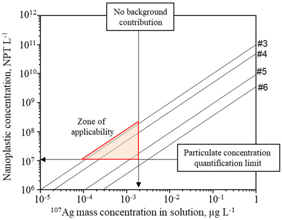 Since the initial concentration of PS22AA in the experiments (around 1.62 × 1012 NPT L−1) is too high for Single Particle analysis [32], samples must be diluted in order to ensure that only one NPT is detected at each reading time. However, the NPTs concentration must remain above a certain limit for its accurate quantification by SP-ICP-MS. For inorganic nanoparticles, LOD obtained by SP-ICP-MS were reported to be in the range of 105–106 part L−1 [33], thus a threshold of 107 part L−1 was selected here for a proper quantification of NPTs in the aim of further analytical development. On the other hand, concerning the background signal, the real situation is far from the best-case scenario mentioned above, and hence the analysed water dispersions must be diluted enough to minimize the impact of the free silver that remains in solution. The expected concentration of free silver in the diluted sample can be calculated using the value [Ag+]e obtained during the adsorption isotherm experiment, assuming that no modification of the adsorbed quantity occurs during the dilution. Figure 3 presents the expected ionic concentration of free silver in the different samples analysed following the NPTs concentration in the diluted samples with the assumption that no modification of Qe occurs. Under such conditions, the quantification of NPTs was not feasible in samples #5 and #6 due to the expected high amount of free silver in the suspension. Nonetheless, a narrow zone of applicability for samples #3 and #4 can be considered.