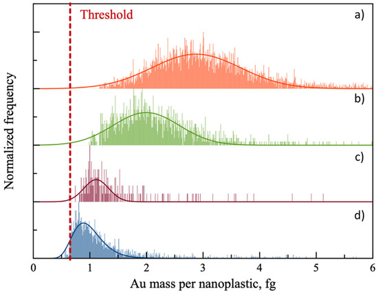 Au mass distributions obtained for samples made of a mixture of (a) PSAA22; (b) PSAA18; (c) PSAA13 and (d) PSAA9 nanoplastic model materials with AuNPs@gel. The red line represents the threshold discriminating between labelled nanoplastics and not bound AuNPs@gel in the sample.