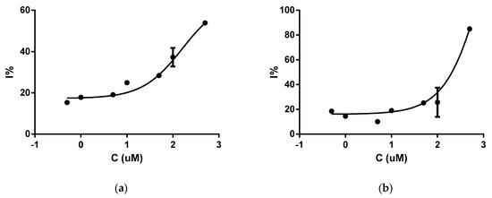 The plotted sortase A inhibition (I%) against compounds logarithm of concentration (μM): (a) compound 1; (b) compound 2.