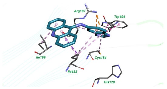 The inhibitor acridin-9-yl-(1H-benzoimidazol-5-yl)-amine is involved in hydrophobic interactions with amino acid residues Ile199, Ile182, Cys184, Trp194 and benzoimidazol heterocycle forms π-cation interactions with Arg197 (Figure 3).
