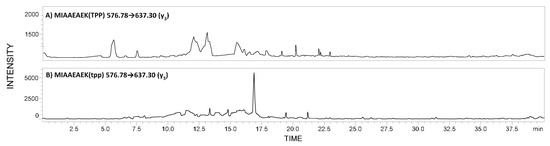 LC-MS/MRM experiments were performed on a LCMS-8050 Shimadzu apparatus, with a UHPLC Nexera X2 system, equipped with an Aeris Peptide XB-C18 column (50 mm × 2.1 mm) 3.6 μm bead diameter, equilibrated at 27 °C. The LC system was operated with mobile phase, consisting of solvent A (0.1% formic acid in H2O) and solvent B (0.1% formic acid in MeCN). The gradient conditions (B%) were from 5 to 80% B within 40 min. The flow rate was 0.1 mL/min, and the injection volume was 5 μL. The MRM method was optimized automatically, and the following transitions were chosen for 292MIAAEAEK299 862.45→347.20 (y3) and 862.45→547.28 (y5); for MIAAEAEK(TPP) [M + H]2+, 576.78→637.30 (y3) and 576.78→308.20 ([TPP − H]+).