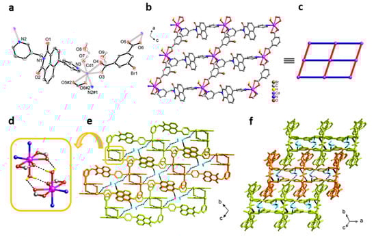 Hydro(solvo) thermal reactions of Cd(NO3)2∙4H2O, Br-1,3-H2bdc, and NI-mbpy-34 in DMF/H2O media afforded 1 as yellowish crystals (Scheme 1). Single-crystal X-ray structure analysis reveals that the crystal structure of 1 belongs to the triclinic space group P. The asymmetric unit contains one Cd(II) center, one Br-1,3-bdc2− dianion, one NI-mbpy-34 ligand, and one coordination and two lattice water molecules (Figure 1a). The Cd(II) center adopts a {CdO5N2} pentagonal bipyramidal geometry, where the equatorial plane is made up of two carboxylate groups of two distinct Br-1,3-bdc2− dianions in one asymmetric (Cd1–O3 = 2.254(2) Å, Cd1–O4 = 2.753 Å) and one symmetric (Cd1–O5#2 = 2.393(2) Å, Cd1–O6#2 = 2.389(2) Å, #2, x − 1, y, z) chelating modes and one 4-pyridyl nitrogen atom (naphthalene end) from one NI-mbpy-34 ligand (Cd1–N3 = 2.301(2) Å), while the two apical positions are located by one coordination water molecule (Cd1–O7 = 2.348(2) Å) and one 3-pyridyl nitrogen atom (imide end) from the other NI-mbpy-34 ligand (Cd1–N2#1 = 2.354(3) Å, #1, x + 1, y + 1, z + 1). Each Br-1,3-bdc2− dianion adopts a μ2-Br-1,3-bdc-κO,Oʹ:κO,Oʹ mode to bridge two Cd(II) centers, where the two carboxylate groups suit an asymmetric and a symmetric chelating coordination mode (Figure 1a). Connection of Cd(II) centers by Br-1,3-bdc2− dianions and NI-mbpy-34 ligands simultaneously forms a two-dimensional (2-D) gridlike layer (Figure 1b), which can be simplified as a 4-connected sql net with the point symbol of (44·62) (Figure 1c). Two such gridlike layers with the coordination water molecules oriented face-to-face are linked together in pair through O–H∙∙∙O hydrogen bonding interactions (O∙∙∙O, 2.723(3) and 2.932(3) Å, Table S1) formed between the coordinated water molecules and the carboxylate oxygen atoms of the Br-1,3-bdc2− ligands (Figure 1d), generating a 2-D hydrogen-bonded bilayer (Figure 1e). When viewed down the crystallographic [100] direction, there are small pores with potential sufficient solvent accessible voids of only about 9.8% of the unit cell volume [45], accompanied by lattice water molecules (Figure 1e). These lattice water molecules form hydrogen-bonding interactions with each other (O∙∙∙O, 3.035(5) Å) and, importantly, with the framework (O∙∙∙O, 2.839(5) and 2.855(4) Å) to expand the 2-D hydrogen-bonded bilayers to be the three-dimensional (3-D) hydrogen-bonded network (Figure 1e,f).