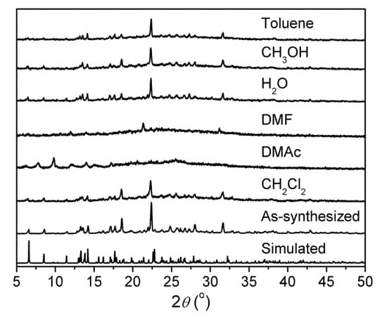 The chemical stability of 1 in different solvents including dichloromethane (CH2Cl2), N,N′-dimethylacetamide (DMAc), N,N′-dimethylformamide (DMF), H2O, methanol (CH3OH), and toluene was checked. After separately immersing 1 in CH2Cl2, H2O, CH3OH, and toluene for 24 h, the checked XRPD patterns of so-obtained powdered samples were very similar to the patterns of as-synthesized 1 after grinding, with slight differences in peak intensity (Figure 2). This might suggest the preferred orientation effect or the minor extent of partial distortion of the long range order in 1. However, the checked XRPD patterns still imply the maintenance of framework integrity and crystallinity, confirming the high stability of 1. In contrast, 1 displayed low stability after immersing in DMAc and DMF due to the poorly matched XRPD profiles.