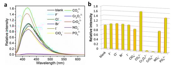 In view of the high water stability and excellent fluorescence properties of 1 in H2O suspension-phase, its potential ability to detect anions was explored in water. Anion detection studies were carried out by separately adding aqueous solutions of NaF and KmX (Xm− = Cl−, Br−, I−, ClO4−, CO32−, Cr2O72−, CrO42−, NO3−, and PO43−, m = 1, 2, 3) into the well-prepared H2O suspensions of 1, with a concentration of 1 mM. Upon excitation at λex = 365 nm, the fluorescence detection results showed that most anions had an inconspicuous fluorescence intensity change effect (<10% change) on 1, except for the CO32−, Cr2O72−, CrO42−, and PO43− ions (Figure 3). It is noted that CO32− and PO43− caused significant fluorescence enhancement by 63% and 44%, respectively. However, the two Cr(VI) oxyanions, Cr2O72− and CrO42−, showed obviously high quenching effects with an efficiency up to 97% and 99%, respectively, (quenching efficiency (%) = (I0 − I)/I0 × 100%, where I0 and I are the maximum fluorescence intensities of 1 before and after addition of a quencher). Therefore, it is suggested to use the fluorescence quenching of 1 to detect trace amounts of Cr2O72− and CrO42− ions in water media. The anti-interference ability of 1 toward Cr2O72− and CrO42− was examined with the existence of different competitive anions in equal concentration. The competition experiments clearly indicated that Cr2O72− and CrO42− both retained high quenching ability to almost completely turn off the fluorescence of 1 when the other interference anions are present (Figure 4), implying high selectivity of 1 toward Cr2O72− and CrO42− over others perturbed anions in water media.