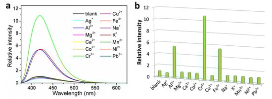 With the advanced development of modern society, rapid industrial and agricultural productions and rich human activities have increasingly brought about severe chemical pollution. Among various chemical pollutants, heavy metal ion based inorganic contaminates are of higher concern compared with other contaminants such as organic pollutants due to their nondegradability and bioaccumulation [1]. Moreover, heavy metal ions are well-known poisonous contaminants in water due to their high toxicity, which could cause serious environmental and ecological harm and cause a detrimental effect on human health [2]. For example, chromium exists in aquatic environments usually in the forms of Cr(VI) oxyanions, i.e., dichromate (Cr2O72−) and chromate (CrO42−) ions, and/or free cation, i.e., trivalent Cr(III) ion. The Cr(VI) oxyanions are highly carcinogenic and mutagenic, causing hereditary genetic defects and various types of cancers [3,4,5]. While the Cr(III) ion is essentially harmless due to its low toxicity, it may, however, cause mutations and malignant cells when excessive accumulation occurs [5,6,7]. The permissible limit for Cr(VI) in drinking water is set as 50 μg/L by the World Health Organization (WHO) [8]. Iron and aluminum are two ubiquitous metals widely used in daily applications around human living environments [9]. Trivalent Fe(III) and Al(III) cations are the forms of iron and aluminum that can enter human body. As one of the most important elements for living organisms, Fe(III) ion influences a variety of vital bioprocesses such as electron transfer, oxygen storage, oxygen metabolism, among others [10,11,12]. The deficiency or excess of Fe(III) ion is harmful to human health, resulting in some diseases [13,14,15]. Additionally, Al(III) ion in body fluids is toxic to humans and will induce harmful effects that cause diseases such as Alzheimer’s disease and Parkinson’s disease when its content in the body is over an acceptable standard [9,12,16]. The tolerable daily ingestion of Al3+ for the human body is about 3–10 mg/day [7] and the permissible level in drinking water is set as 7.41 μM by the WHO [17].
