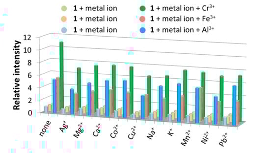 Bar diagrams to show fluorescence enhancement of 1 in H2O suspension-phase for Cr3+, Fe3+, and Al3+ ions with different competitive metal ions in equal concentration (1.0 mM).