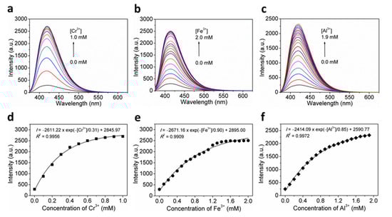 (a–c) Concentration-dependent fluorescence emission spectra of 1 in H2O suspension-phase by incremental addition of Cr3+, Fe3+, and Al3+ ions upon excitation at λex = 365 nm. (d–f) Plot of fluorescence intensity at λem = 414 nm versus Cr3+, Fe3+, or Al3+ ion concentration for 1 in H2O suspension-phase, showing the first-order exponential decay.