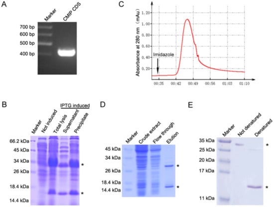 The expression of the recombinant CMIP (rCMIP) was achieved using the pET-30a expression system (Invitrogen, Carlsbad, CA, USA). One clone with correct insertion grew in LB liquid medium containing 50 μg/mL of kanamycin at 37 °C overnight. Then, the culture was inoculated into LB liquid medium (1:100) containing ampicillin (50 μg/mL) and was cultured under the conditions given above to reach 0.6–0.8 optical density (OD) at 600 nm. Afterward, IPTG was added to the culture at a final concentration of 0.5 mM. Then, the mixture was incubated at 37 °C for 5 h. Finally, the cultured E. coli cells were harvested by centrifugation at 8000× g at 4 °C for 15 min. Pellet cells were collected, washed three times with PBS buffer and then sonicated. The lysate was centrifuged at 12,000× g at 4 °C for 20 min. The supernatant was collected for further purification.