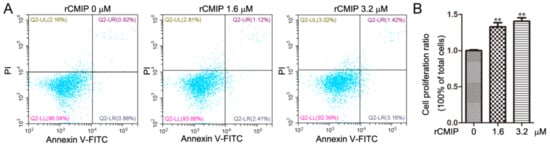 Effect of rCMIP on the growth of RAW 264.7 cells. (A) RAW 264.7 cells were treated with 1.6 μM and 3.2 μM of rCMIP for 24 h. Cells treated with PBS acted as the control. The apoptotic RAW 264.7 cells gated on Annexin V+/PI- were determined by Annexin V/PI double staining and a flow cytometric assay. (B) Cell proliferation of RAW 264.7 cells treated by rCMIP (0 μM, 1.6 μM and 3.2 μM) for 24 h was analyzed by CCK-8 assay. The data shown are the means ± SD (** p < 0.01) of three independent experiments.