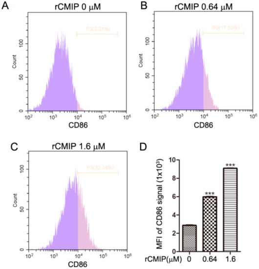 The RAW 264.7 cells treated with rCMIP (0 μM, 0.64 μM and 1.6 μM) for 24 h were collected by gentle scraping using the PBS buffer and washed twice with the same buffer. Then, the cells were incubated with flow cytometry antibody APC CD86 (BioLegend, San Diego, CA, USA) on ice for 30 min. After staining, the cells were washed twice and then subjected to flow cytometry analysis.