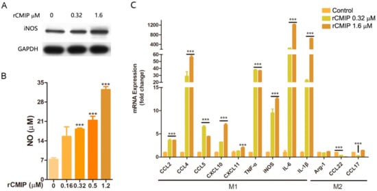 Effects of rCMIP on the polarization of RAW 264.7 cells. (A) iNOS protein expression of RAW 264.7 cells treated by rCMIP (0 μM, 0.32μM and 1.6μM) was analyzed by Western blot. (B) The release of NO in response to rCMIP (0 μM, 0.16 μM, 0.32 μM, 0.5 μM and 1.2 μM) treatment. (C) RAW 264.7 cells were treated with rCMIP (0 μM, 0.32 μM and 1.6 μM) for 3 h. The mRNA expression fold changes of M1 polarization mRNA (CCL2, CCL4, CCL5, CXCL11, CXCL10, IL-1β, TNF-α, iNOS and IL-6) and M2 polarization mRNA (Arg-1, CCL22 and CCL17) were tested by q-PCR assay. Data were expressed as the means ± SD (n = 3) (*** p < 0.001).