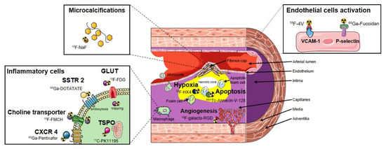 Different processes related to inflammation occurring in atherosclerotic plaques are represented (presence of inflammatory cells, angiogenesis, apoptosis, hypoxia, microcalcifications and endothelial cells activation). Numerous radiotracers able to track the presence of inflammatory cells in the vascular wall have been described. [18F]FDG is metabolically trapped after entering in the cell using glucose transporters (GLUT). Its uptake correlates with macrophages activity but suffers from a poor signal to noise ratio due to the concomitant glucose metabolism of non-inflammatory cells. It stimulates the need for more specific probes that are currently assessed such as: [68Ga]Ga-DOTA-TATE which accumulates in the cell by endocytosis after binding to the somatostatin receptor type 2 (SSTR 2); [18F]fluoromethylcholine ([18F]FMCH) that enters in phospholipids metabolism after passing through the choline transporter; [11C]PK11195 that target the 18-kDa translocator protein (TSPO) expressed on the outer mitochondrial membrane and 68Ga-pentixafor, which is a high affinity and selective ligand of the C-X-C chemokine receptor type 4 (CXCR4). Macrophages account for the majority of apoptotic cells within atherosclerotic plaques, and the programmed cell death of intraplaque macrophages, for instance, can be explored through use of the gamma emitter [99mTc]Tc-Annexin-V-128. Inflammation is also a driver for a number of secondary hallmarks of plaque vulnerability. Intraplaque calcification (microcalcifications), which occurs in the fibrous cap, as it can be detected using [18F]fluoride (Na[18F]F), is initiated by inflammation and also thought to be part of a positive feedback mechanism. Also, angiogenesis contributes to plaque instability through intra-plaque haemorrhage and inflammatory cell infiltration, and is characterized by the overexpression of integrins (e.g., αvβ3 integrin) tracked by different peptides containing the RGD sequence (e.g., [68Ga]Ga-NOTA-RGD, [18F]galacto-RGD). The level of hypoxia is positively correlated with angiogenesis and increases in expanding plaques; it can be measured using a positron emitter such as the third-generation 2-nitroimidazole nucleoside analogue [18F]flortanidazole ([18F]HX4). Dysfunction of the endothelium may constitute an interesting biological pathway to track through the detection of adhesion molecules such as the vascular cell adhesion molecule-1 (VCAM-1) that can be targeted by a tetrameric linear peptide (TLP) radiolabeled with 4-[18F]fluorobenzaldehyde to form [18F]fluorobenzoyl-TLP ([18F]4V) or the P-selectin (targeted by [68Ga]Ga-fucoidan) expressed early at the surface of activated endothelial cells.