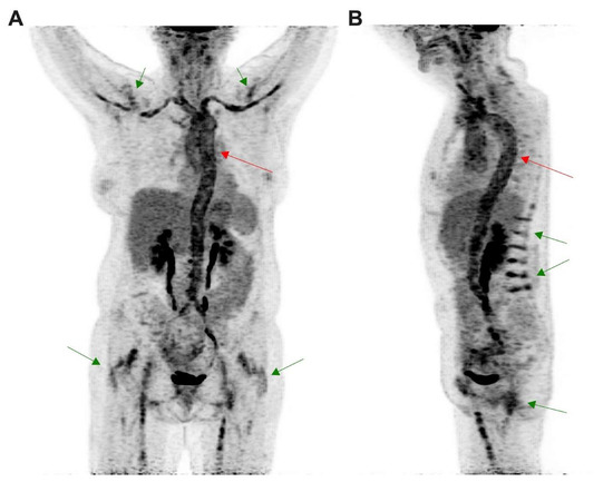 [18F]FDG PET/CT was performed in a 64 year old patient for a suspicion of giant cell arteritis. (A) Coronal and (B) sagittal images obtained from maximal intensity projection revealed intense uptake in the vascular wall from the whole aorta (red arrows) extended to axillary and femoral vessels, above the liver uptake, corresponding to an LVV. LVV was associated with patterns of polymyalgia rheumatica (green arrows) corresponding to interspinous bursitis ((B) green arrow) and also inflammation in hips and shoulders joints ((A) green arrow).