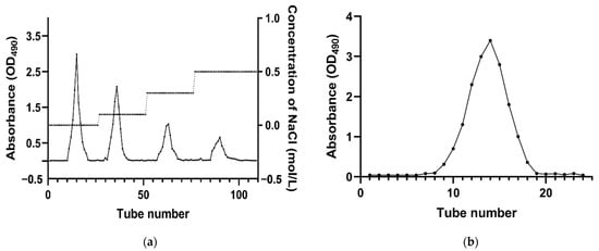 Elution curves of crude polysaccharides from O. fimbriata on DEAE cellulose-52 column (a) and Sephadex G-75 column (b).