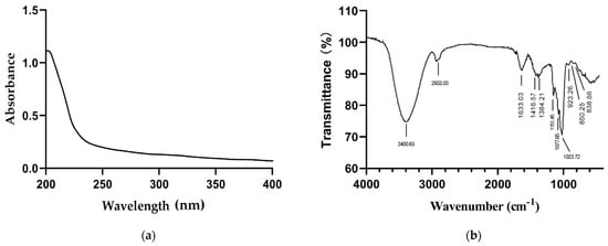 The absence of peaks in the UV spectrum at 260 and 280 nm (Figure 4a) indicated that OFP was free of nucleic acid and proteins []. FT-IR spectroscopy at wavenumber within the range 4000–400 cm−1 was used for analysis of the structure and ring forms of OFP (Figure 4b). The spectrum featured the characteristic absorption peak of polysaccharide, the strong and wide bands around 3400.63 cm−1 due to -OH vibration, and a weak absorption band at 2932.03 cm−1, which is attributed to C-H stretching vibration []. The weak absorption bands located at 1633.03 cm−1 are ascribed to adsorbed water [], while the absorption bands at 1416.57 cm−1 and 1384.21 cm−1 are assigned to C-H bending vibration []. Bands between 1000 and 1200 cm−1 are typical of C-O bending vibration []. The characteristic absorption band at 923.26 cm−1 suggested the presence of pyranoside configurations in OFP. The peaks at 850.25 cm−1 and 838.66 cm−1 were assigned to the presence of α-type and β-type glycosidic linkages [,].