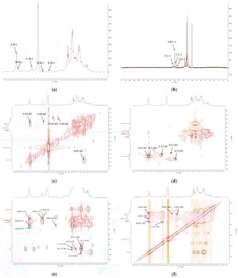 OFP showed five anomeric proton signals at 5.29, 5.24, 4.84, 4.54, and 4.40 ppm respectively when probed by 1H spectrum (Figure 5a). Likewise, in the 13C spectrum (Figure 5b), five carbon signals were recorded at 102.66, 99.69, 99.55, 97.77, and 95.73 ppm. On examination of HSQC spectra (Figure 5d), signals of carbon and proton in the anomeric region were found at 5.29 (99.55), 5.24 (99.69), 4.84 (97.77), 4.54 (95.73), and 4.40 (102.66) ppm, which were distributed amongst residues A, B, C, D, and E, respectively. By analyzing the two-dimensional NMR spectrum, we obtained the signal values of C and H on the sugar ring, including the connection between sugar residues.