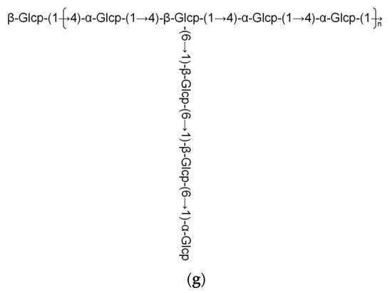 To summarize, combining the results of methylation analysis and NMR spectroscopy, we hypothesized that the main chain of OFP is likely composed of →4)-α-Glcp-(1→ and a small quantity of →4,6)-β-Glcp-(1→, while the side chain is probably formed from →6)-β-Glcp-(1→, α-Glcp-(1→ and β-Glcp-(1→. The proposed structure for OFP is presented in Figure 5g.