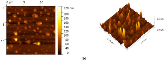 AFM enables high-resolution imaging of polysaccharide samples at the nanoscale, and it is routinely used to observe the conformation of individual macromolecules while obtaining quantitative information such as chain length and diameter []. The AFM image of OFP (Figure 6b) showed irregular polymer particles in water, suggesting that the sugar chain molecules of OFP were clustered together. The observed polymer particles were due to the formation of crosslinks between the polysaccharide molecules. In addition, the height of the OFP was 228 nm, which was much greater than the height of the single-chain polysaccharide molecule (0.1–1.0 nm), which also indicates that the molecular chains of OFP were intertwined to form a polymer.