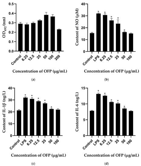 Effect of OFP on the viability of RAW264.7 cells and production of pro-inflammatory factors. Effect of OFP on (a) RAW264.7 cell proliferation, (b) NO production, (c) IL-1 β production, and (d) IL-6 production. * p < 0.05, as compared with the control group.