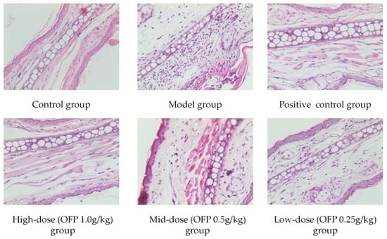 Xylene-induced ear swelling in mice is regarded as a reliable model for evaluating anti-inflammatory behavior. Ear swelling is always accompanied by the release of pro-inflammatory factors, which result in increased capillary permeability and the inflammatory cell infiltration of surrounding tissues []. OFP inhibited xylene-induced ear swelling in mice by almost 50% at all concentrations tested (Table 3). H&E staining of tissue samples taken from the left auricle showed that OFP possessed anti-inflammatory activity at all concentrations tested, while doses of 1.0 g/kg and 0.5 g/kg significantly improved the lesion (Figure 8). In the untreated control group, which was not exposed to xylene, the subcutaneous connective tissue was closely arranged without edema and inflammatory cell infiltration. The ear tissue in the group exposed to xylene was significantly swollen and hypertrophic in comparison. In addition, skin ulcers were observed, and the subcutaneous connective tissue was arranged sparsely with inflammatory cell infiltration. The congestion, swelling, and inflammatory cell infiltration were alleviated in OFP groups compared with untreated animals, and the reduction was significant in the high/medium concentration OFP groups. The results show that OFP could reduce inflammation by inhibiting the release of inflammatory factors. Our findings demonstrated that OFP exhibits significant anti-oedematous and anti-inflammatory activity with potential for clinical application.