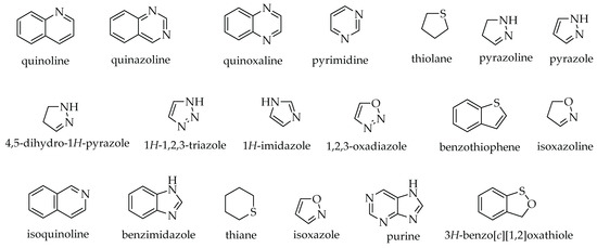 Many natural products such as alkaloids, flavonoids, terpenoids, coumarins, anthocyanins, isothiazoles, etc., contain heterocyclic rings, possess a broad spectrum of activities against numerous disease-causing organisms. In addition, recent structural assessment of heterocyclic moieties among synthetic compounds by Marson has revealed that their incorporation plays a very significant role in drug-likeness and target binding by limiting toxic metabolite production, increasing water solubility, and lowering conformational entropy [40]. Heterocyclic chemotypes like quinoline, quinazoline, quinoxaline, pyrimidine, pyrazoline, 1,2,4-triazole, imidazole, benzimidazole, isoxazoline, isoquinoline, pyrazole, and isoxazole (Figure 3) can be found in compounds used in the treatment of debilitating diseases like malaria, tuberculosis, cancer, neuro-degenerative diseases, fungal, and bacterial infections [41,42,43]. The following are heterocyclic compounds that, if present as moieties in synthetic or naturally occurring compounds, may confer anti-cancer properties.