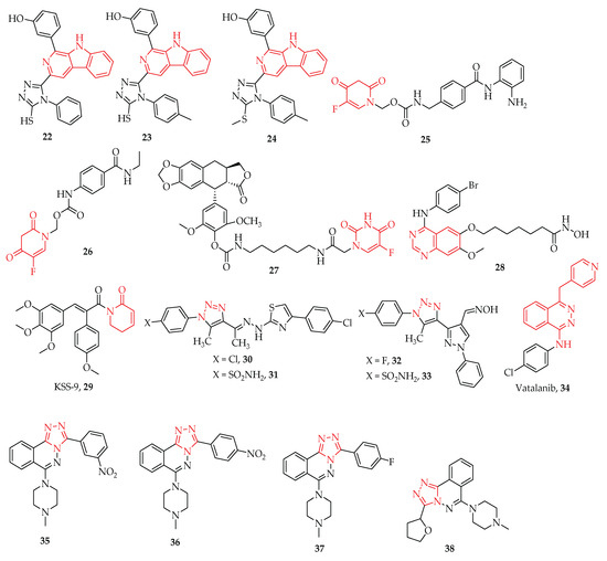 Additionally, cell studies of the combined histone deacylase (HDAC) inhibitors 25 and 26 with fluorouracil, an isosteric replacement for pyridine against HDAC protein source (Hela cell nuclear extract), resulted in inhibitory potentials of 5.92 and 2.31 μM for compounds 25 and 26 compared to the moderate anti-proliferative activity estimated with seven tumor cell panels (K-562, A549, U266, PC-3, HCT-116, ES-2, and HL-7720) [46]. Discovery of the essential role of angiogenesis in tumor progression by Judah Folkman in the late 20th century has been recently supported by many genetic and epidemiological studies [47]. Similarly, a combination of deoxy-podophyllotoxin and 5-fluorouracil-yl showed an increased cytotoxic activity against tumor cell lines compared with the anticancer drugs VP-16 and 5-FU [48].