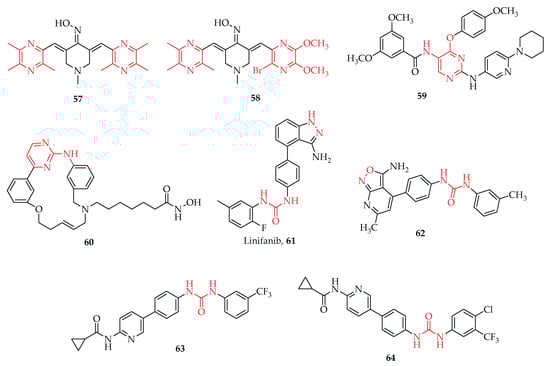 Derivatives of ligustrazine (57,58), 5-amino-4-pyrimidinol (59), N-(2-aminophenyl) benzamide acridine (60), Linifanib (61) and its isoxazol[3,4-b]pyridine-3-amino-derivative 62, as well as other biphenyl-aryl urea derivative (63 and 64).