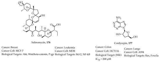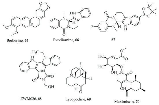 Lycopodine, 69, the main alkaloid of Lycopodium clavatum extract was reported to have anticancer effect on HeLa cells through DNA damage, 5-LOX inhibition, G0/G1 cell cycle arrest, deactivation of oxidation resistance (OXR) receptor and mitochondrion membrane depolarization [85]. J. Robles and co-workers identified maximiscin 70 as possessing multitarget anticancer properties [86]. They investigated its activity against cancer cell lines in vitro and in a xenograft mouse model of melanoma and found that 70 inhibited proliferation of all of the following five triple-negative breast cancer cell lines at the stated IC50 values: MDA-MB-468 (0.6 µM), MDA-MB-231 (39 µM), MDA-MB-453 (15 µM), HCC-70 (60 µM), and BT-549 (15 µM) [86]. It is suggested that the mechanism of action of the compound involves the induction of DNA damage as the primary suicidal action as well as activation of DNA damage response pathways and cell cycle arrest [86].
