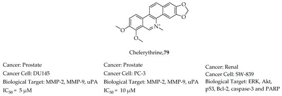 Chelerythrine 79, isolated from Chelidonium majus, Z. xanthoxyloides, Z. clavaherculis, and Z. rhoifolium among others, is a potent, selective, and cell-permeable protein kinase C inhibitor [105]. Chelerythrine exhibits its antitumor properties by inhibiting the proliferation of androgen-independent prostate cancer cells DU145 and PC-3 at concentrations of 5 and 10 μM [106]. Western blot analysis revealed that 79 inhibited metastasis of prostate cancer cells by suppressing MMP-2, MMP-9, and uPA and also boosted the expression of endogenous inhibitors TIMP-1 and TIMP-2 as well as plasminogen activator inhibitors (PAI-1 and PAI-2) [106]. In vitro and in vivo studies have also disclosed the effects of 79 on the growth inhibition and apoptosis induction on HEK-293 and SW-839 renal cancer cells [107]. Chelerythrine, 79, also significantly inhibits the phosphorylation of extracellular signal-regulated kinase (ERK) and Akt accompanied by upregulation of p53, and downregulation of Bcl-2, caspase-3, and PARP (Figure 13) [107].