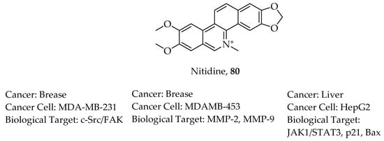 Nitidine 80 is found mostly in the roots of Zanthoxylum nitidum (Fagara nitida), Z. gilletii (Fagara macrophylla), Z. tessmanii, and Z. chalybeum (Fagara chalybea). Nitidine was first reported from Z. nitidum in 1958 by Arthur et al. [108]. It was later reported from Z. gilletii (Fagara macrophylla) by Torto and Addae-Mensah in 1970, Wall et al. in 1971, and Fish and Waterman in 1972 [109,110,111,112]. Since then, it has been isolated from other Zanthoxylum species as well as Toddalia asiatica. It is usually isolated in the form of its chloride salt, and is noted mostly for its antimalarial and cardiovascular activities [113,114,115]. It has also been extensively investigated for its wide variety of bioactivity including its anti-tumor activity against various malignancies. Nitidine is a very strong inhibitor of topoisomerase I enzyme at 0.05–0.3 μM with significant selectivity. However, its effect on topoisomerase II is only moderate [116,117]. DNA topoisomerases are enzymes that regulate the conformational changes in DNA topology by catalyzing the concerted cleavage and polymerization of DNA strands during cellular growth. Recent studies have identified them as putative targets for drug design against various forms of cancers. Nitidine also impedes breast cancer cell migration and invasion via inactivation of c-Src/FAK pathway as well as downregulation of MMP-2 and MMP-9 [118]. An in vivo study revealed the suppression of hepatocellular carcinoma cell proliferation by the inhibition of the JAK1/STAT3 signaling pathways. Associated with this is the increased levels of p21 and Bax as well as decreased levels of cyclinD1, CDK4 and Bcl-2 (Figure 14) [119].