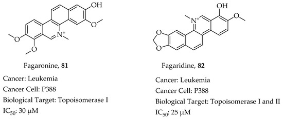 Closely related to nitidine but less toxic are fagaronine, 81 and fagaridine, 82, which are major constituent alkaloids of Z. xanthoxyloides (Fagara xanthoxyloides). The two compounds have been extensively investigated for their mutagenic activities [121,122]. The anticancer activity of fagaronine was first reported by Messmer and his coworkers, who found it to effect complete cure in mice infected with the P-388 lymphocytic leukemia [123]. It was subsequently found to be very active against chronic myeloid leukemia (cell line K 562) as well as several other cancers of viral origin [124]. Fagaronine exhibits its antileukemic activity by inhibiting both Topoisomerase I and II at concentrations of 30 and 25 μM [125]. Fagaridine, first reported from Z. xanthoxyloides by Torto et al., [126] inhibits topoisomerase I, effectively stabilizes topoisomerase I-DNA binary complex, and intercalates into DNA [127]. A synthetic isomer of fagaridine, N-109, is said to be more stable and possess greater activity than all the naturally occurring benzophenanthridine alkaloids (Figure 15) [109].