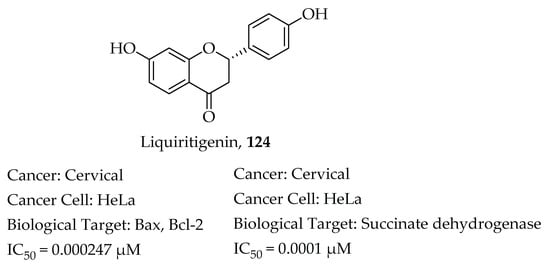 The benzophenanthridine alkaloids are generally isolated from natural sources as their quaternary ammonium salts. Sanguinarine, 78 has been isolated from the roots of Sanguinaria canadensis, Chelidonium majus, Argemone mexicana as well as the roots and leaves of Zanthoxylum(Fagara xanthoxyloides) zanthoxyloides, Z. bungeanum and Z. gilletii (Fagara macrophylla). The compound has diverse medicinal properties including anticancer properties. Although the underlying mechanism of action for Sanguinarine as an anti-tumor agent is yet to be fully elucidated, Xu et al. reported that 78 caused a concentration-dependent inhibition of growth in HeLa and SiHa human cervical cancer with IC50 values of 2.43 and 3.07 μM, respectively [103]. Cell cycle analysis revealed apoptosis induction was as a result of downregulation of Bcl-2 and NF-κB and an upregulation of Bax protein expression [103]. Sanguinarine is also reported to cause cell cycle obstruction and induce apoptosis of human prostate carcinoma cells via attenuation of cyclin dependent kinases (Figure 12) [104].