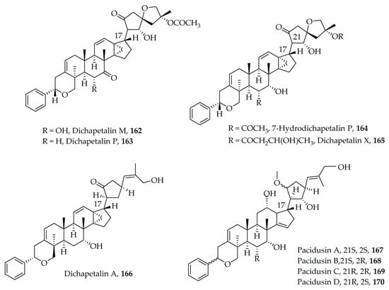 - Addae-Mensah, I.; Waibel, R.; Asunka, S.A.; Oppong, I.V.; Achenbach, H. The dichapetalins—A new class of triterpenoids. Phytochemistry 1996, 43, 649–656. [Google Scholar] [CrossRef]