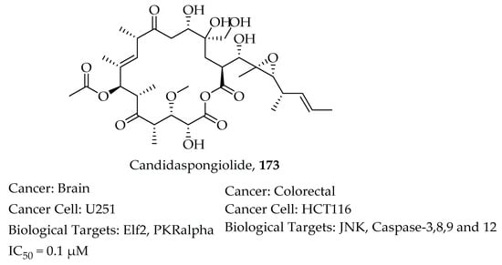 Didemnins are depsipeptides isolated from the sea squirt. They possess activity against various cancers including P388 lymphocytic leukemia and B16 melanoma [87]. Didemnin B, 71 is reported to target DNA functionality [88]. It perturbs cell-cycle and inhibits the synthesis of DNA at the elongation phase via the dual inhibition of palmitoyl-protein thioesterase 1 (PPT1) and eukaryotic translation elongation factor-1α (EEF1A1) [89]. It also activates caspases, thereby inducing apoptosis and inhibits protein synthesis by preventing eukaryotic elongation factor (Eef-2)-dependent translocation (Figure 8) [90].