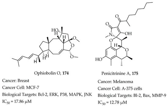 - Yang, T.; Lu, Z.; Meng, L.; Wei, S.; Hong, K.; Zhu, W.; Huang, C. The novel agent ophiobolin O induces apoptosis and cell cycle arrest of MCF-7 cells through activation of MAPK signaling pathways. Bioorg. Med. Chem. Lett. 2012, 22, 579–585. [Google Scholar] [CrossRef]