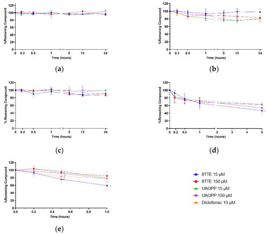 8TTE, UA-3-O-PP and positive controls stability profiles in different simulated physiologic conditions at two different concentrations (15 µM–150 µM): (a) water; (b) phosphate Buffer 0.1 M pH 7.4; (c) entire plasma; (d) HCl pH 1.2; (e) pooled male mouse microsomes. Non-parametric ANOVA analysis: p < 0.05 (Kruskal–Wallis and Dunn’s tests).