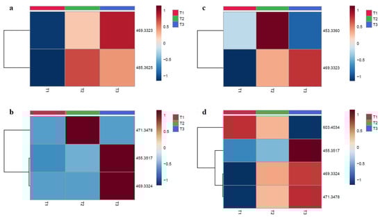 Heatmaps of molecular ions intensity in function of the tested timepoints for 8TTE and UA-3-O-PP. Each column represents an average of three samples (n = 3), and the rows represent a corresponding m/z. (red color = more expressed; blue color = less expressed): (a) 8TTE 15 µM; (b) 8TTE = 150 µM; (c) UA-3-O-PP 15 µM; (d) UA-3-O-PP 150 µM (T1 = 0 min, T2 = 30 min; T3 = 60 min). Analysis was performed using Euclidian distance method with ward clustering algorithm after normalization to sample median and Pareto scaling.