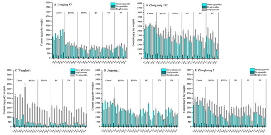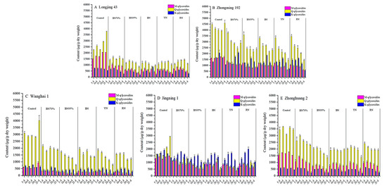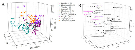 2.3. Impacts of Shade Treatments on the Profiles of Flavonol Glycosides in the Young Shoots of Different Tea Cultivars