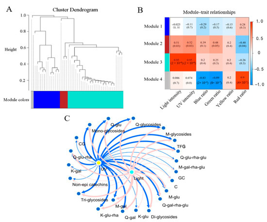 - Ye, J.-H.; Lv, Y.-Q.; Liu, S.-R.; Jin, J.; Wang, Y.-F.; Wei, C.-L.; Zhao, S.-Q. Effects of light intensity and spectral composition on the transcriptome profiles of leaves in shade-grown tea plants (Camellia sinensis L.) and regulatory network of flavonoid biosynthesis. Molecules 2021, 26, 5836. [Google Scholar] [CrossRef]