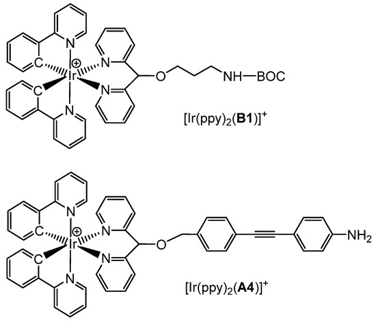 - Herr, J.M.; Rössiger, C.; Locke, H.; Wilhelm, M.; Becker, J.; Heimbrodt, W.; Schlettwein, D.; Göttlich, R. Synthesis, Optical and Theoretical Characterization of Heteroleptic Iridium(III) Imidazo[1,5-a]Pyridine and -Quinoline Complexes. Dyes Pigment. 2020, 180, 108512. [Google Scholar] [CrossRef]