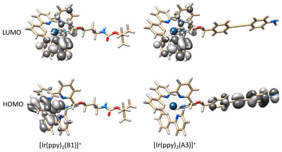 | [Ir(ppy)2(B1)]+ | 380 314 sh 260 | 549 509 479 | 8% | 605 | E1/2 = 0.953 | Ep = −2.363 Ep = −2.595 |