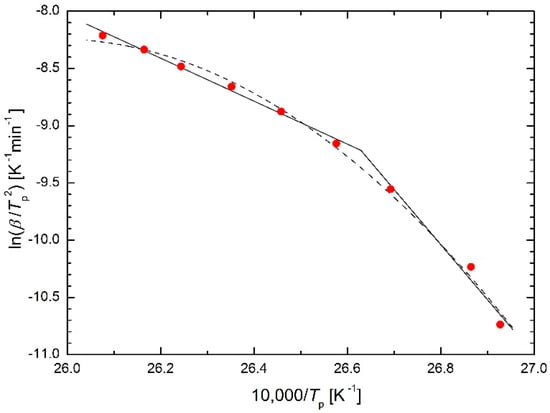 - In terms of regression: is it correct to replace an almost smooth arc with two straight lines? If, in a study [5], the heating at heating rates of, e.g., 40 K/min and 35 K/min is not performed and heating at, e.g., 2 K/min and 1 K/min is added, then very likely the straight lines in the Kissinger plot will change their positions substantially, i.e., not only the two values of activation energy will change substantially, but also the value of heating rate separating these straight lines. What is the usefulness of the results obtained in this way?