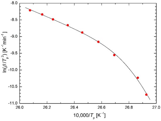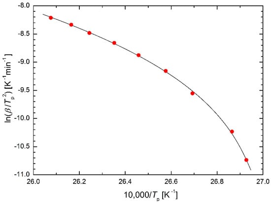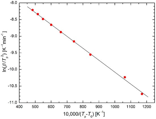 The Kissinger equation, published in 1957 [6], received many thousands of citations and Kissinger became probably the most important figure in the field of differential thermal analysis (DTA) [7]. Šesták et al. [8,9] accounted for the thermal inertia component of the heat flow omitted by Kissinger, leading to a more accurate determination of the activation energy and to distinguish the temperature of the extreme deviation of the DTA from the temperature at which the reaction rate is maximum. For the purposes of the presented paper, Equation (3) is sufficient. Temperatures corresponding to the maximum reaction rates would be useful, but unfortunately, the authors of the papers whose data are used for regression calculations presented here have not mentioned their values.